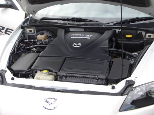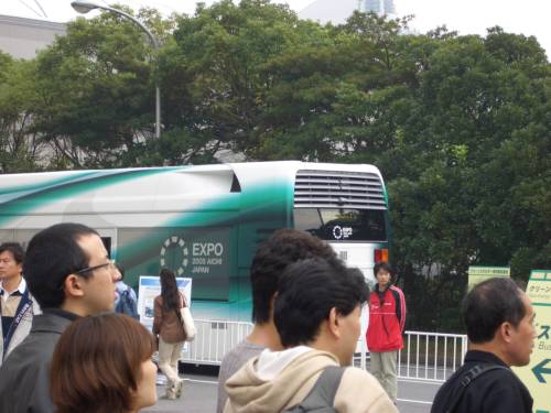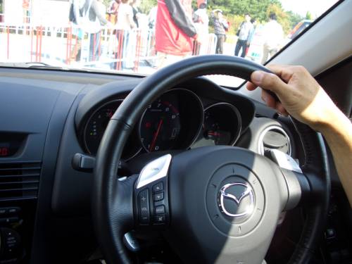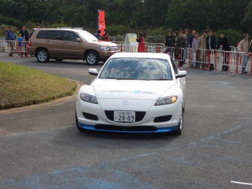 我々はマツダの水素ロータリーエンジン車(RX-8ハイドロジェンRE)に試乗。これに乗るために早めに会場に来たのですが、人気が高く一回目の整理券は取れませんでした。